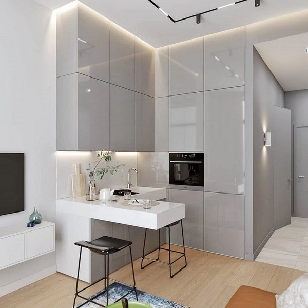 Pay attention to functional transforming furniture and kitchen sets for built-in appliances. Folding tables, non-standard ways of storing accessories: cabinets can include hidden corners for household appliances, shelving for spices can be easily attached to the inner edge of the cabinet door, and the wall is used to fasten essential items.