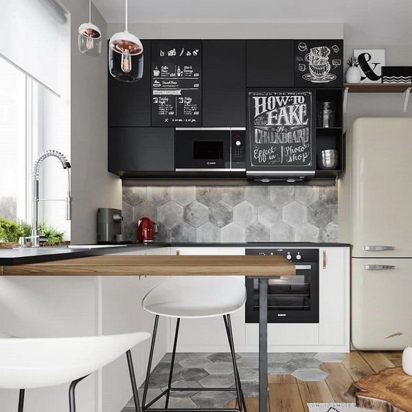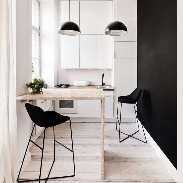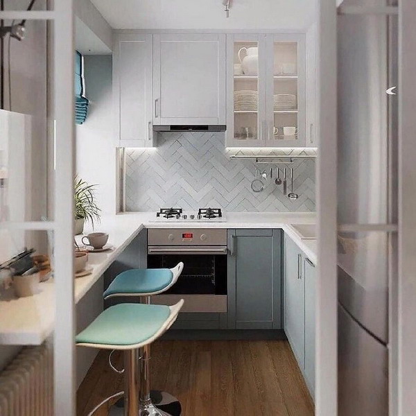 Choose built-in smart appliances that make your kitchen design easier. If there is not enough variety, then you can add zest to the kitchen interior with the help of an apron made of durable triplex glass, having previously placed an interesting print on its surface. As for the dining area, often small kitchens can not accommodate a full, so you have to look for another solution. One of the good options may be to place a narrow bar counter with high stools or folding structures. The role of the dining table can perfectly fulfill the converted window sill.
