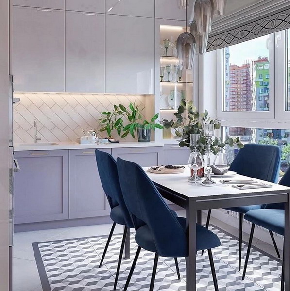 For those who are especially brave, I would recommend mirrors, for example, along the wall where the table is located. The ceilings are white and without levels (it will be good to use a stretch mat ceiling). Porcelain tiles on the floor and on the apron are better to choose one color, and indeed from one collection, so that there are fewer colors and textures.