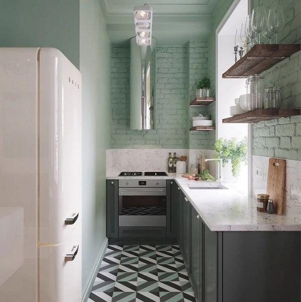 In 90% of cases it will be true to make a white kitchen and light walls. Apron – large format tiles. On the floor, too, no need to grind. The ideal tile size is 60 * 60 mm, this condition also applies to the apron. Place the cabinets close to the ceiling to visually raise the height of the room, because they are usually not tall in small apartments and Khrushchev.