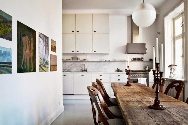 If you like the look of recovered wood, but do not want to sand your entire kitchen, you can use wooden boards as in the photo.