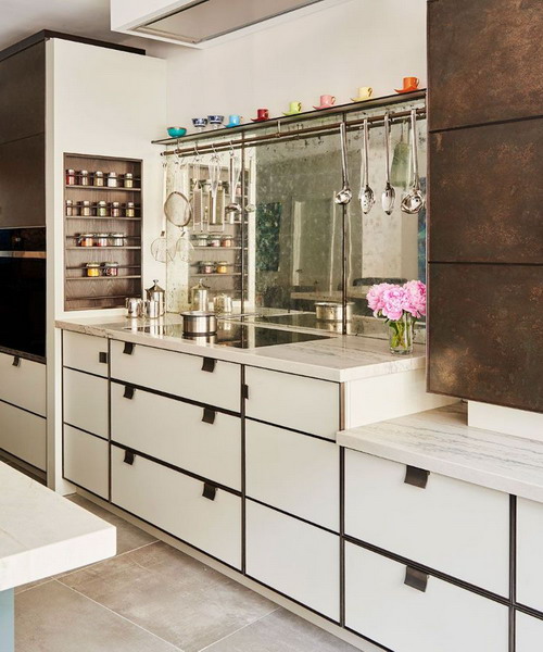 With the central island, this monolith which marked the beginning of the era of the open kitchen of the “American” type, the cupboards are becoming more and more discreet. No more XL handles, the kitchen trend is now bare doors! More elegant and modern, they are equipped with a system of pushers or a groove (a space carved in the door to be able to catch it). Simple, discreet and easy to install, cupboards without handles are also very easy to clean!