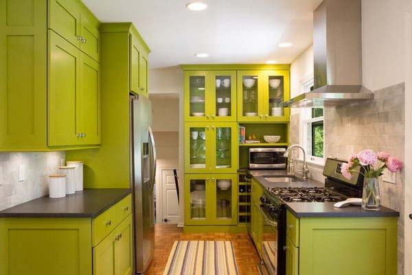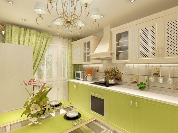 Of the brighter colors, you can turn to yellow variations. Do not make the kitchen too bright, it can hurt your eyes and quickly tire, so saturated contrasting colors are best used only to create an accent.