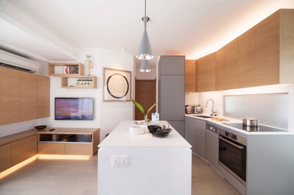 The kitchen island option is suitable for a studio apartment. In this case, an extract must be above it so that the smells of food do not hover around the house.