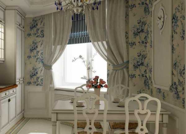 If you are a fan of white furniture in the kitchen, openwork curtains, cozy textiles here, you can take “cold” wallpapers with a barely noticeable bluish pattern. They will get rid of the effect of a white kitchen a la operating room, but they will add soft rustic elegance to the kitchen.