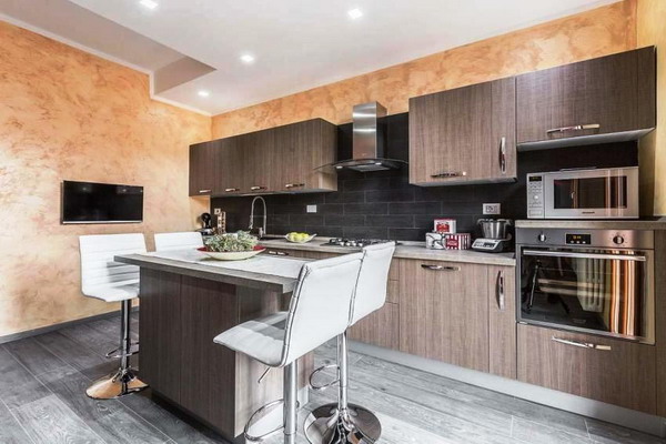 The most popular types of kitchen plaster: Venetian and Moroccan. They allow you to copy natural stone and give the finish a texture of marble or travertine. Using the sgraffito technique, they create the illusion of an applique or aged surface, as well as imitation of silk and velvet. Depending on the chosen style, the walls are decorated with bark beetle plaster or create an analogy of a concrete wall.