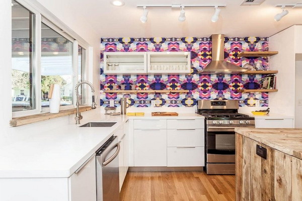 In the decoration of the walls of the kitchen, material with a fine pattern or plain color is best suited to avoid variegation. Dosage should also be decorative elements. If the emphasis is on the tile, then other areas should be less bright, without contrasting patterns.