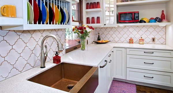 The material has a different shape. It can be circles, rhombuses, ovals, rectangles. The most popular are the classic squares. Recently, a variety in the form of a continuous web has been especially common. More often it covers a work wall and an apron. On the countertop, it also looks great, and the mosaic wall panel will become an original decoration of the room.